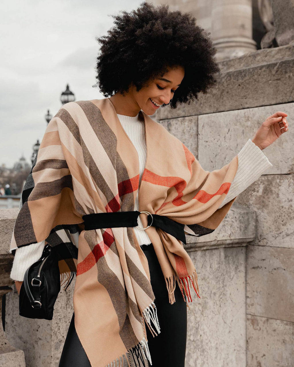 Rock your FRAAS Plaid with this essential accessory for every season. Our original FRAAS Plaid pattern in this soft acrylic ruana shape can coordinate with your entire wardrobe. Have this transitional cape at the office, while out walking the dog, or thrown on for dinner on the patio. Have you tried tying it with a belt? Or pin it up on your shoulder for a chic poncho look Made in Germany, this is the perfect gift for any age, any style - no need to worry about size!