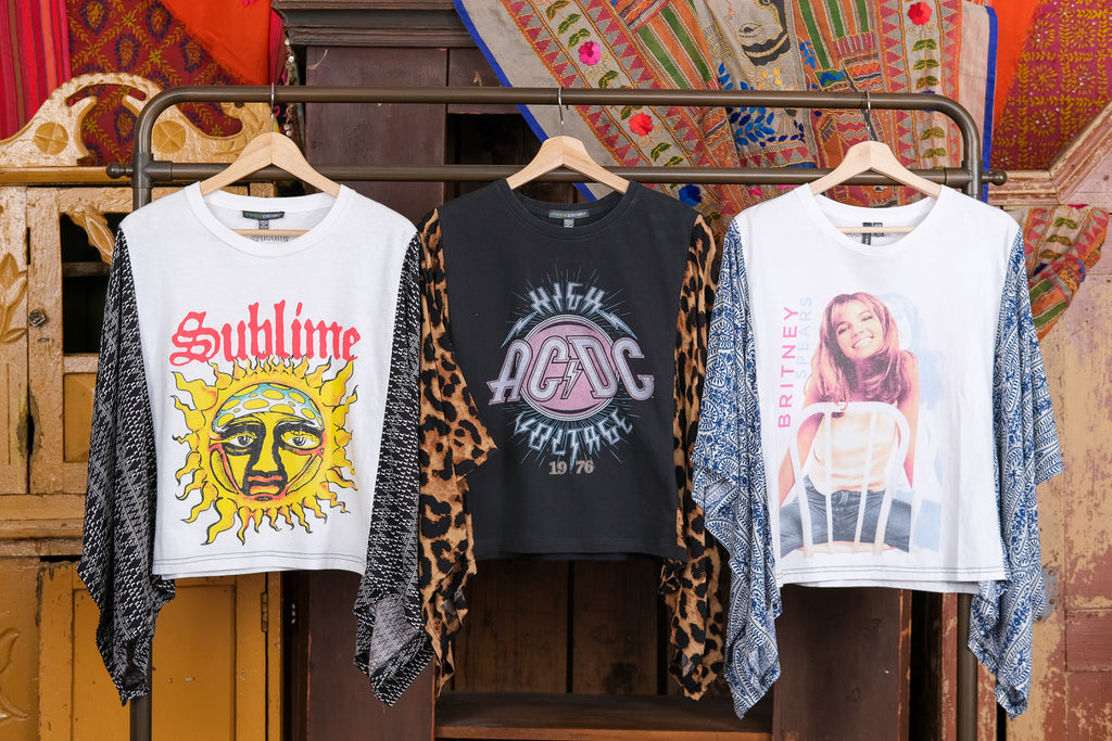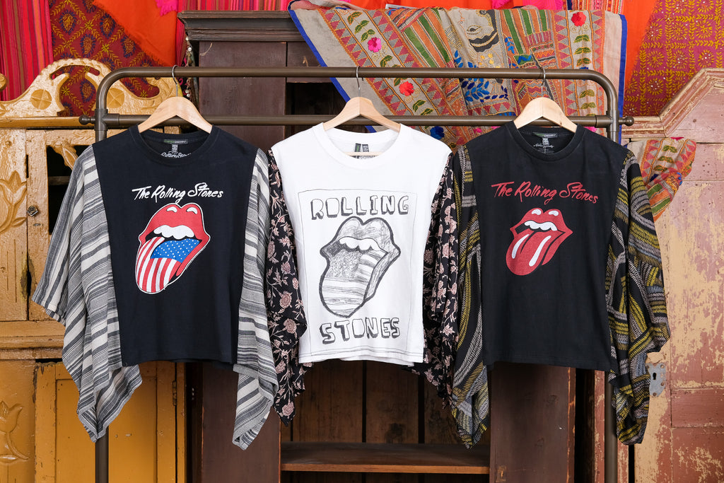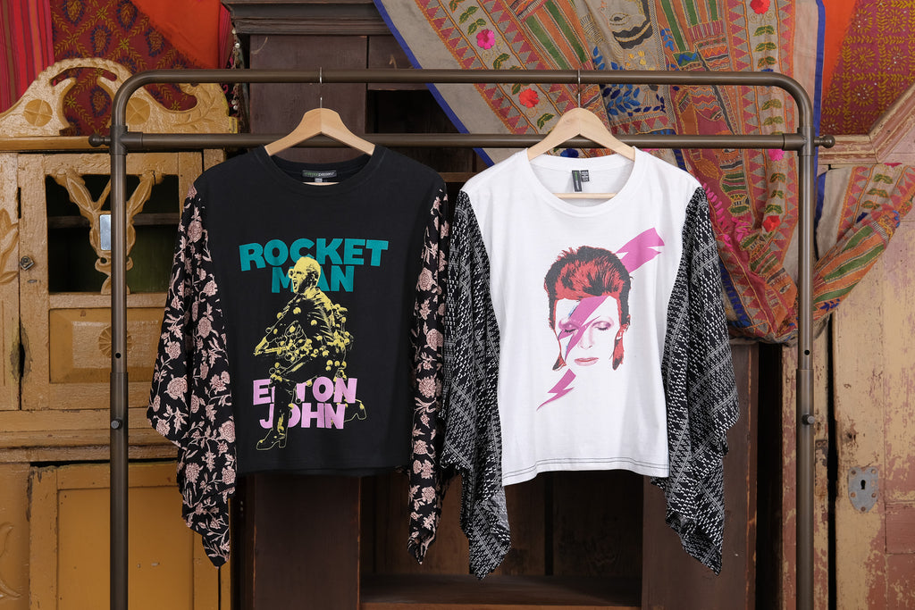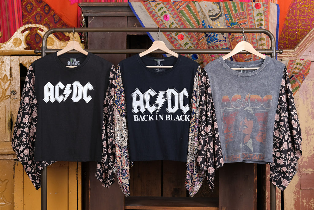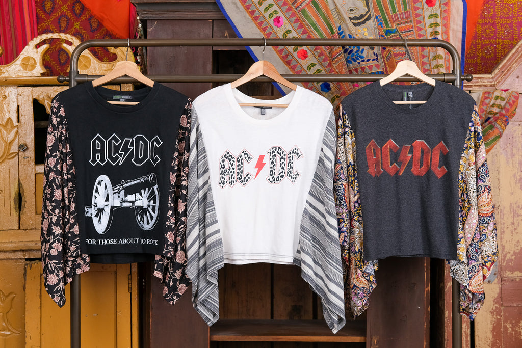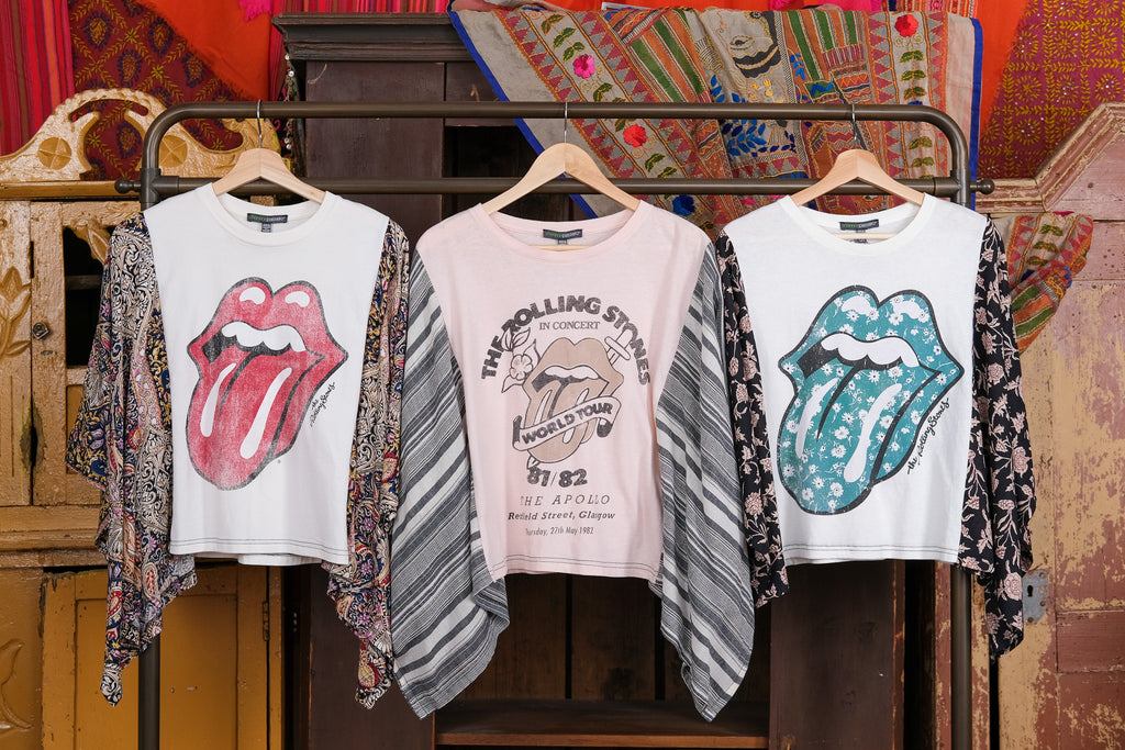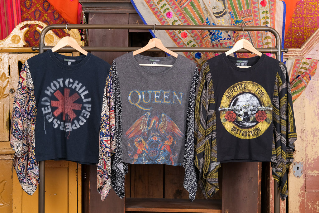 These pieces have been made using upcycled Rock band tees, each piece is one-of-a-kind and designed combining deconstructed vintage denim and upcycled band tees. This diverts it from the landfills and gives it new life.