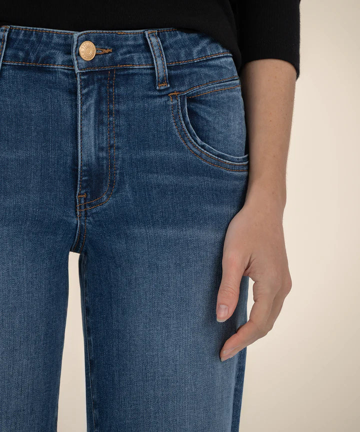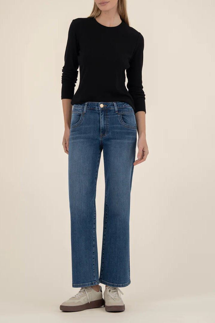 Discover the perfect blend of style and comfort with these high-rise straight leg jeans in a sleek black wash. Featuring unique porkchop pockets, double belt loops, and stylish double front buttons, they’re crafted from very stretchy fabric for a flattering fit that moves with you all day long.