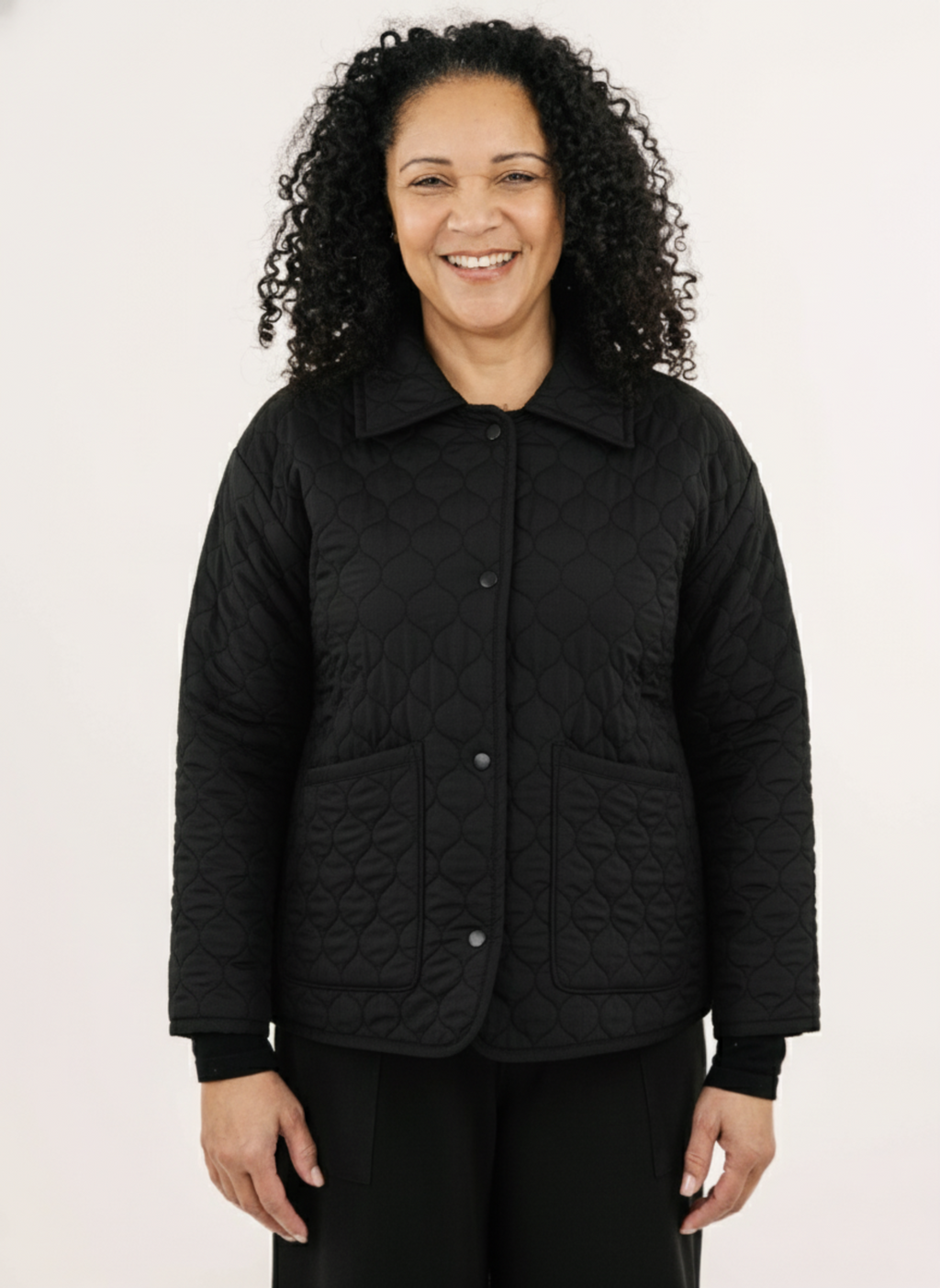 Our modern quilted fabric is versatile and flattering. The patterned quilting is accented with our unique buttons and snaps details making it ready for any occasion. Made with our family run small batch factory in Turkey.