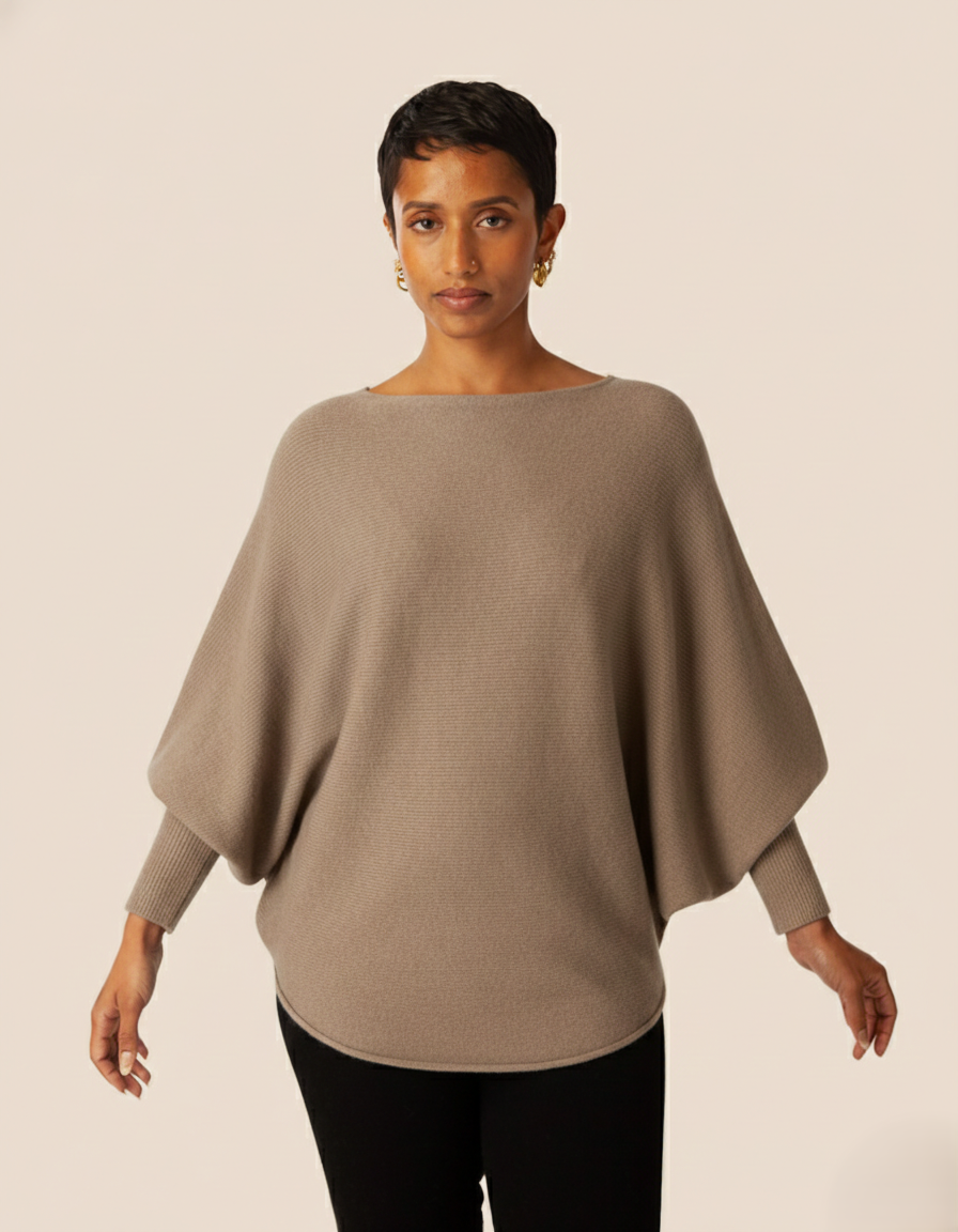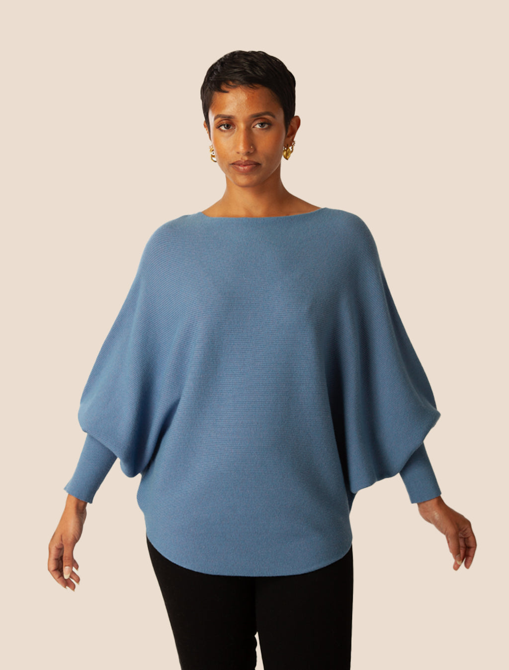 Boat neck top with 3/4 length dolman sleeves and curved sweep in fine rib stitch.