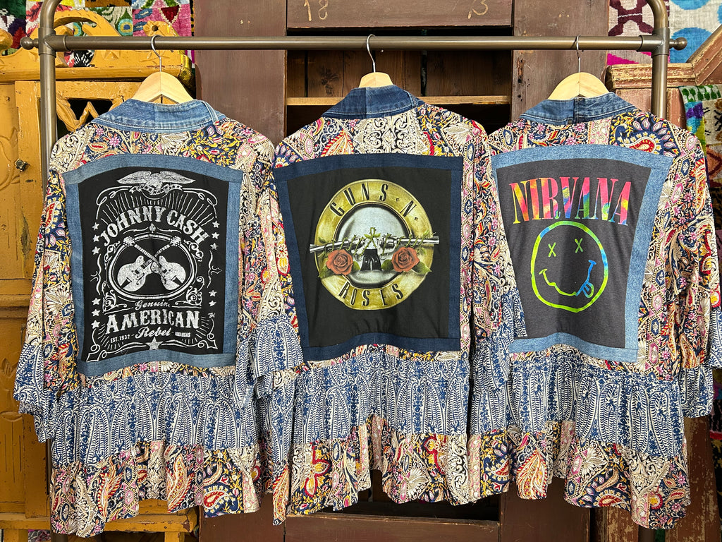 These pieces have been made using upcycled Rock band tees, each piece is one-of-a-kind and designed combining deconstructed vintage denim and upcycled band tees. This diverts it from the landfills and gives it new life.