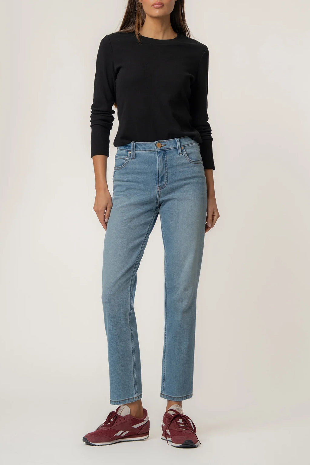 - These high-rise straight leg jeans blend style and comfort effortlessly, featuring flattering Fab Ab pockets that shape and smooth. The classic medium wash pairs perfectly with the timeless 5-pocket design, while the super stretchy fabric keeps you moving freely. A modern essential that’s as comfortable as it is confident.