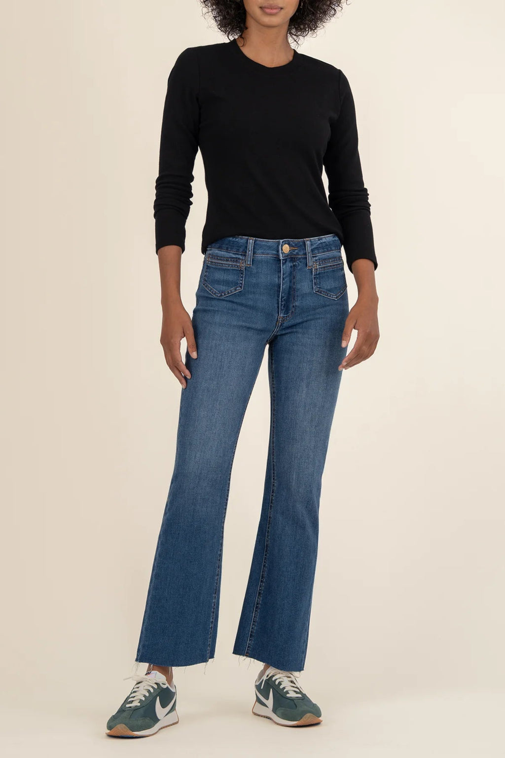 Step up your style with these high-rise ankle flare jeans in a versatile medium wash. Designed with practical front patch pockets and made from very stretchy fabric, they offer a comfortable fit and a flattering silhouette perfect for any casual occasion.