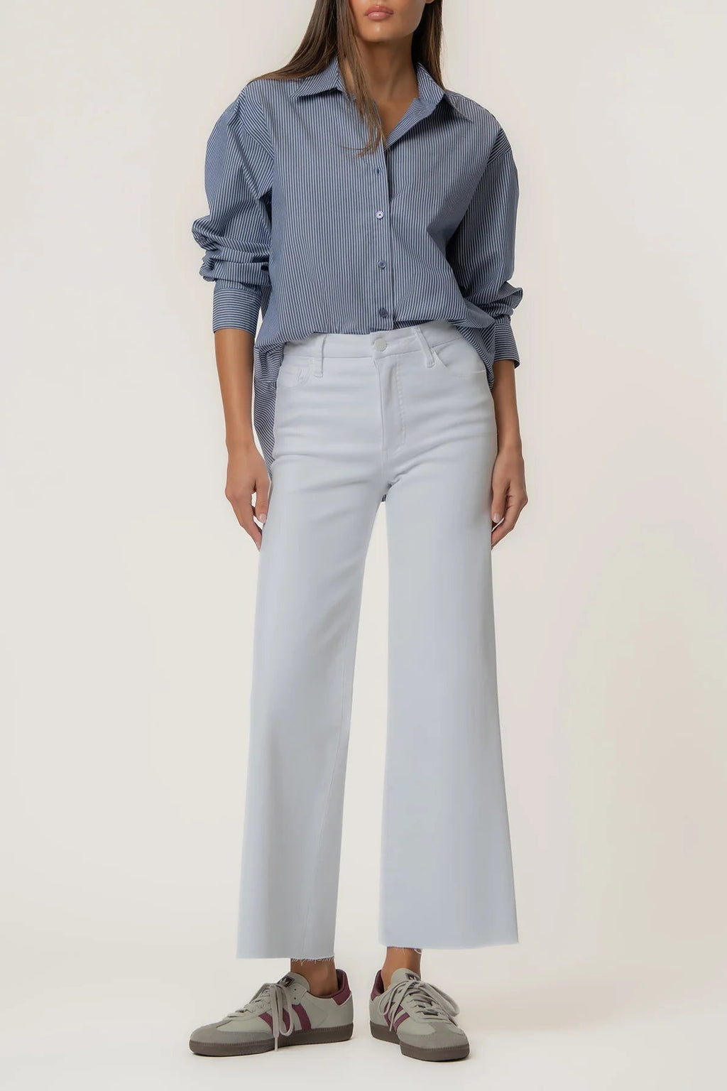 Step up your everyday style with these high-rise, wide-leg pants made from a comfortable, stretchy material. Finished in sleek optic white, they feature figure-flattering Fab Ab pockets for a smooth, streamlined look. The modern raw hem adds an effortless edge, making them easy to dress up or down. A versatile staple that delivers style and comfort in every wear.