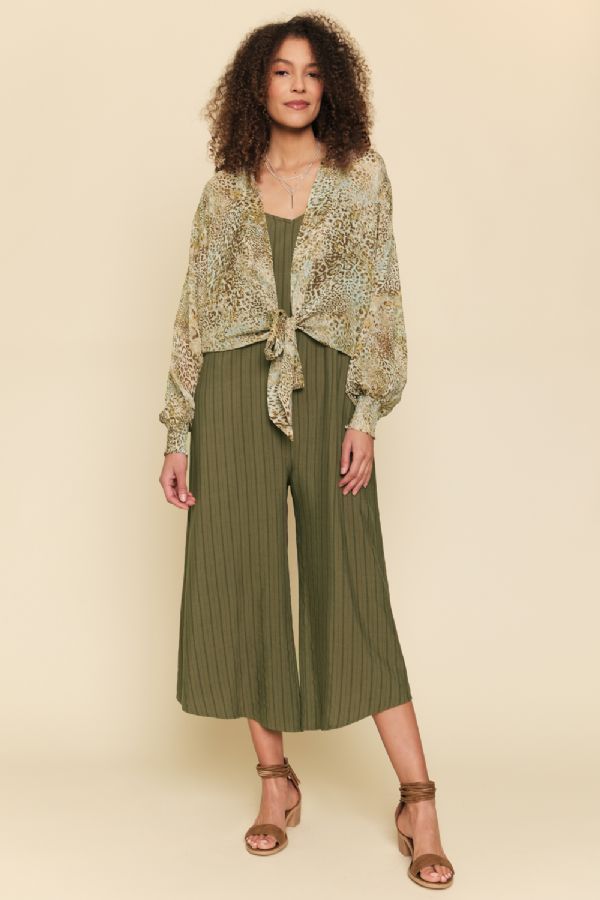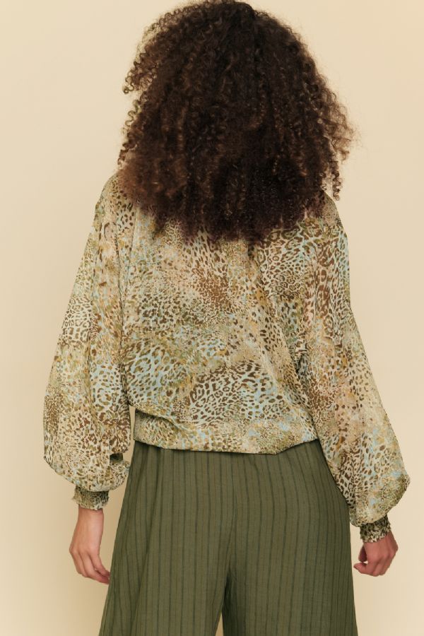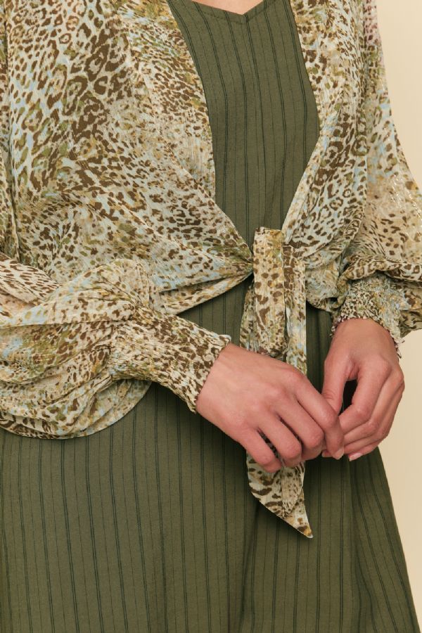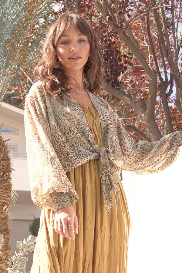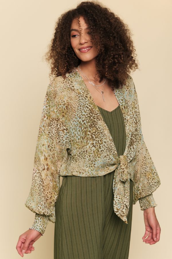 Embrace your wild side with a layer that feels as light as air. The Leopard Tie Front Kimono reimagines the classic animal print with a soft, watercolor-inspired palette. Crafted from a sheer, gauzy fabric, it features dramatic balloon sleeves with smocked elastic cuffs that create a beautiful, billowy silhouette. The functional tie-front detail allows you to cinch the waist for structure, making it the perfect romantic overlay for your favorite spring dresses.