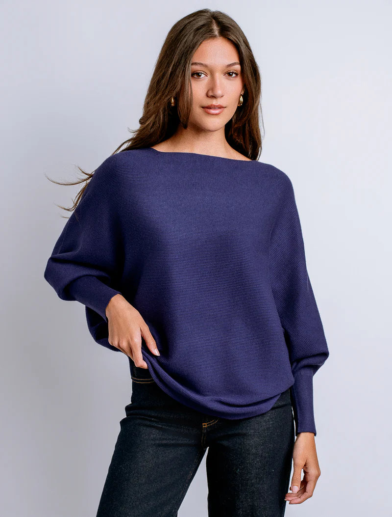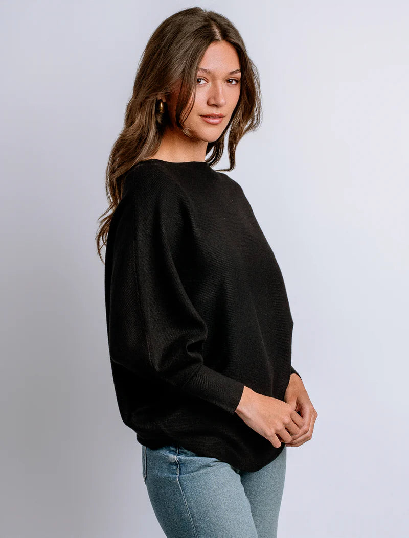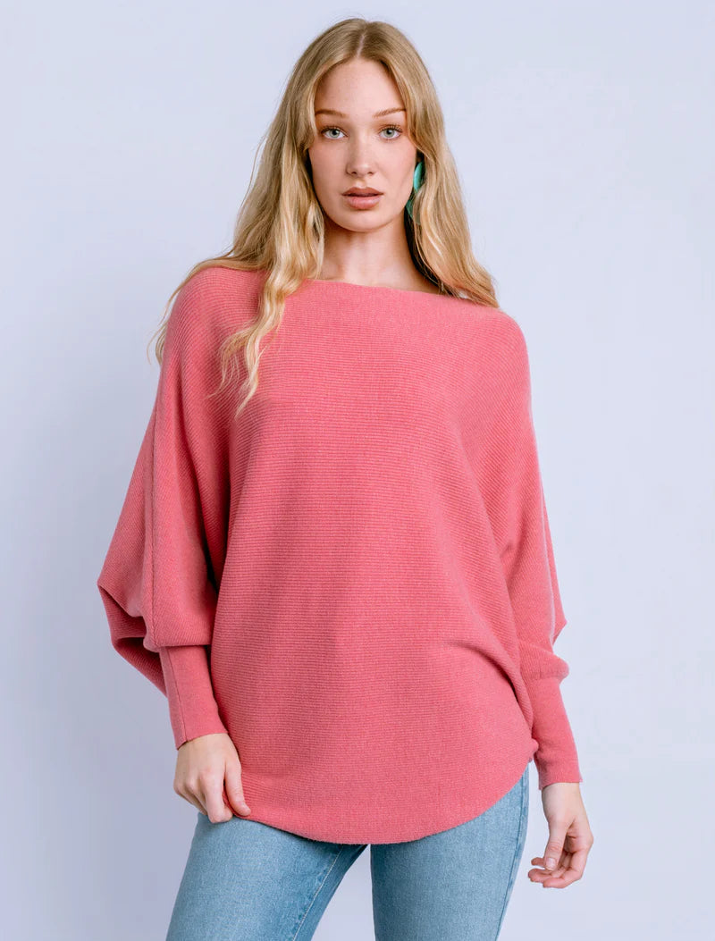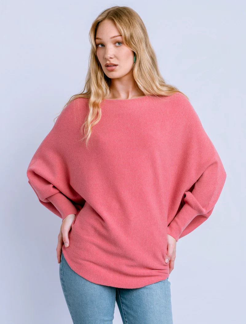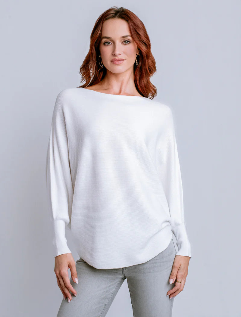 Boat neck top with 3/4 length dolman sleeves and curved sweep in fine rib stitch.