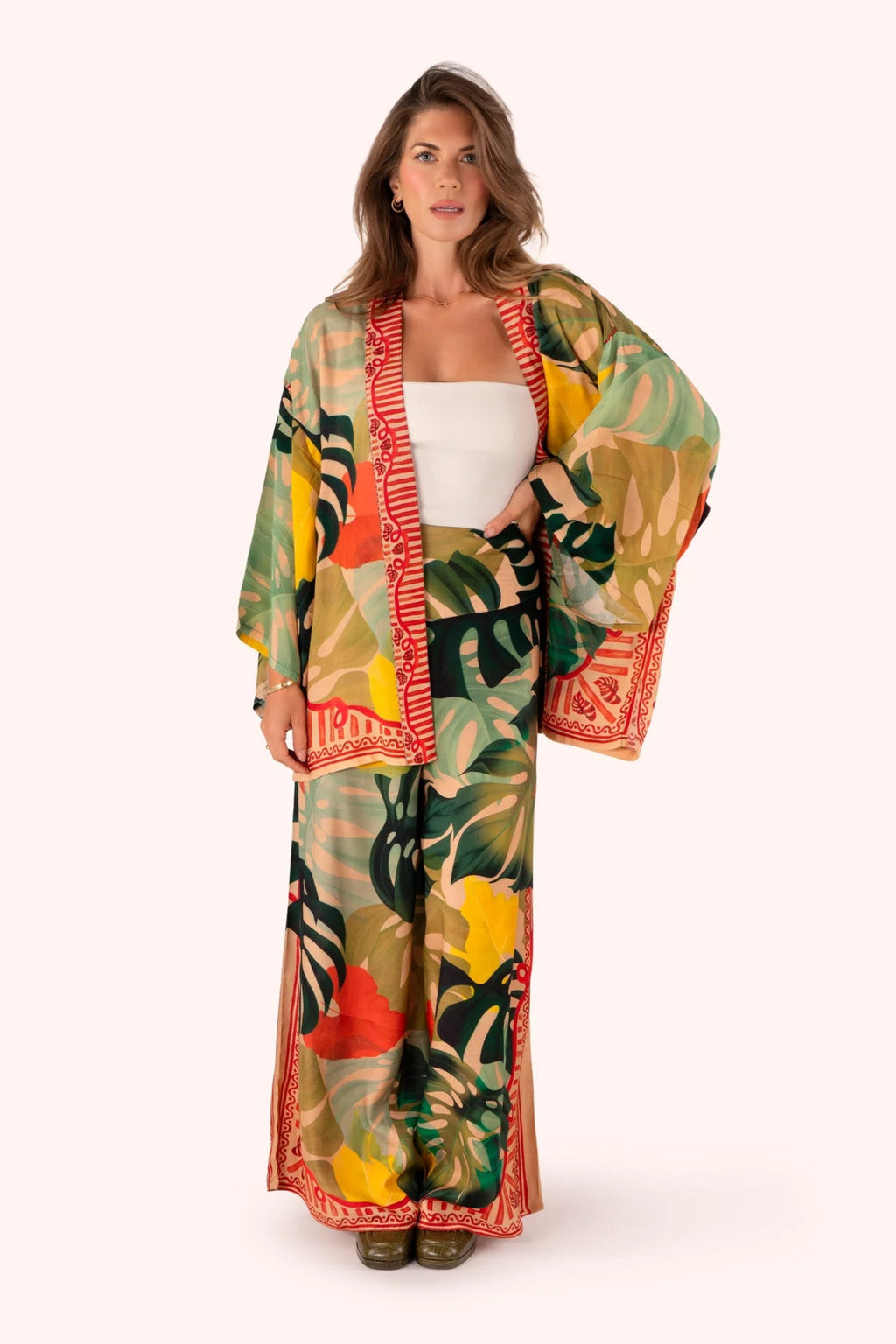 Our Exotic Leaves wide leg trousers feature striking leaves with intertwining vibrant tones. Sunny and partially shaded, this rainforest inspired design is perfect for all art and travel lovers! Equally suited to wear to the pool or to elevate your night look, you will never want to take them off. Go on, treat yourself!