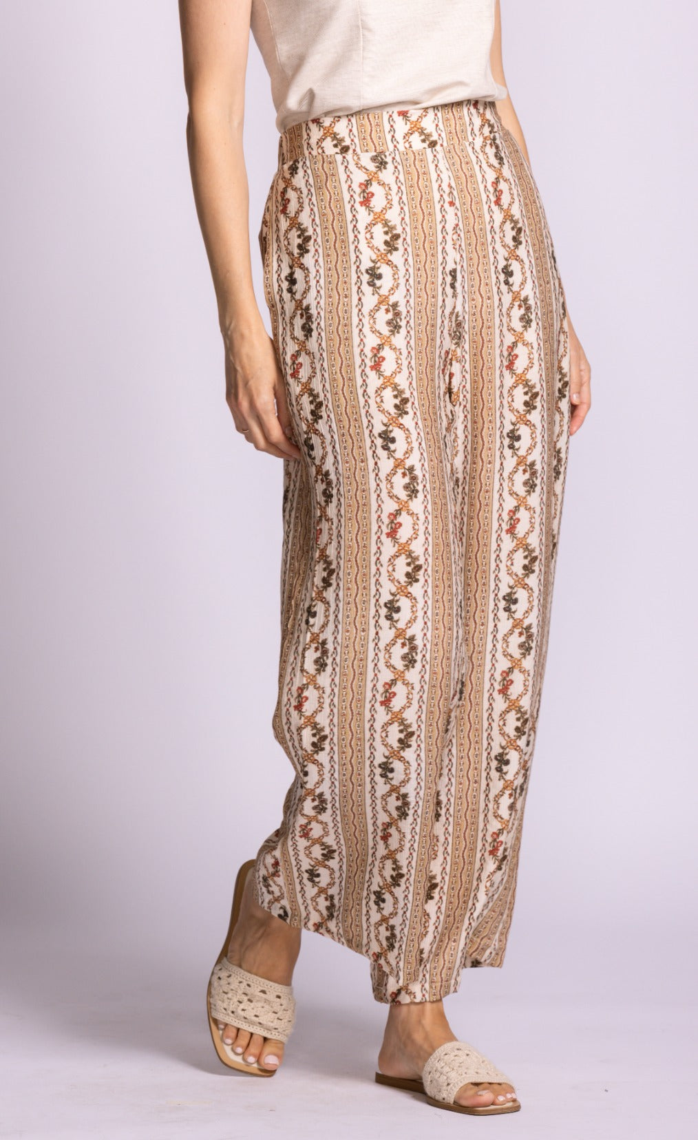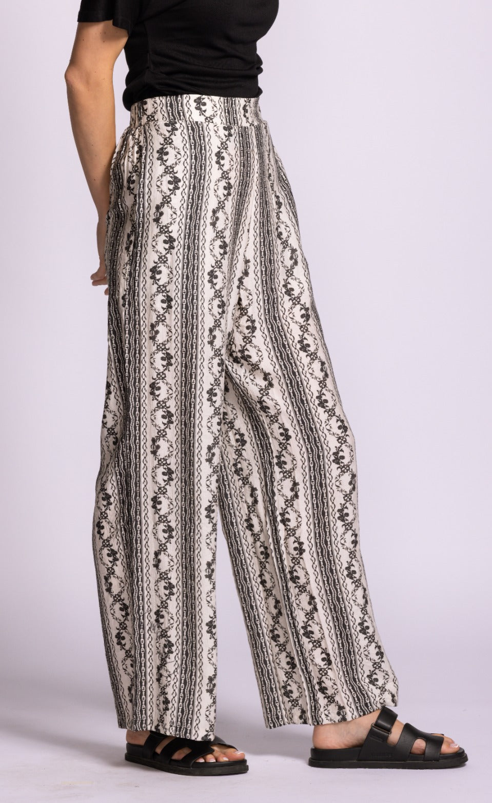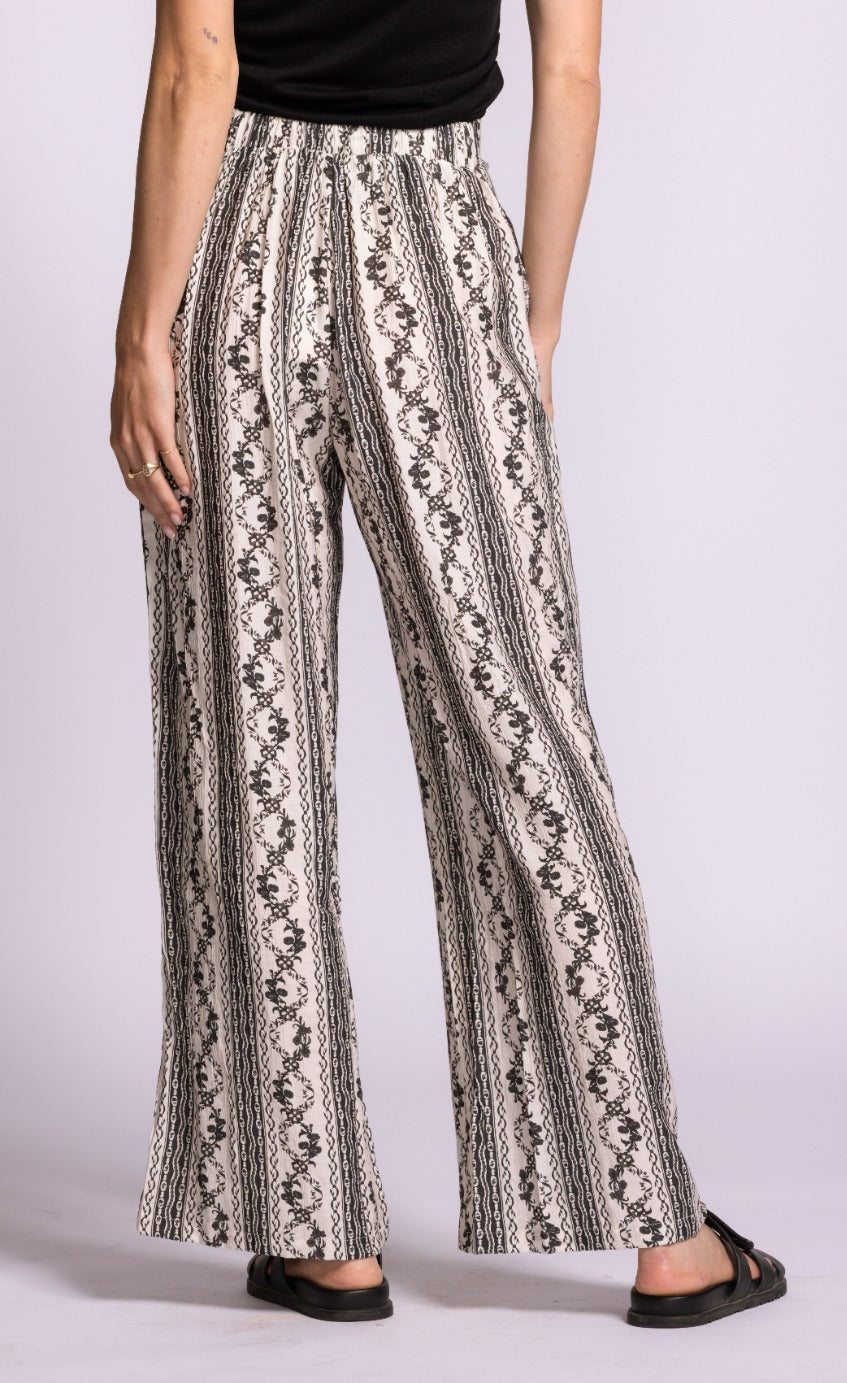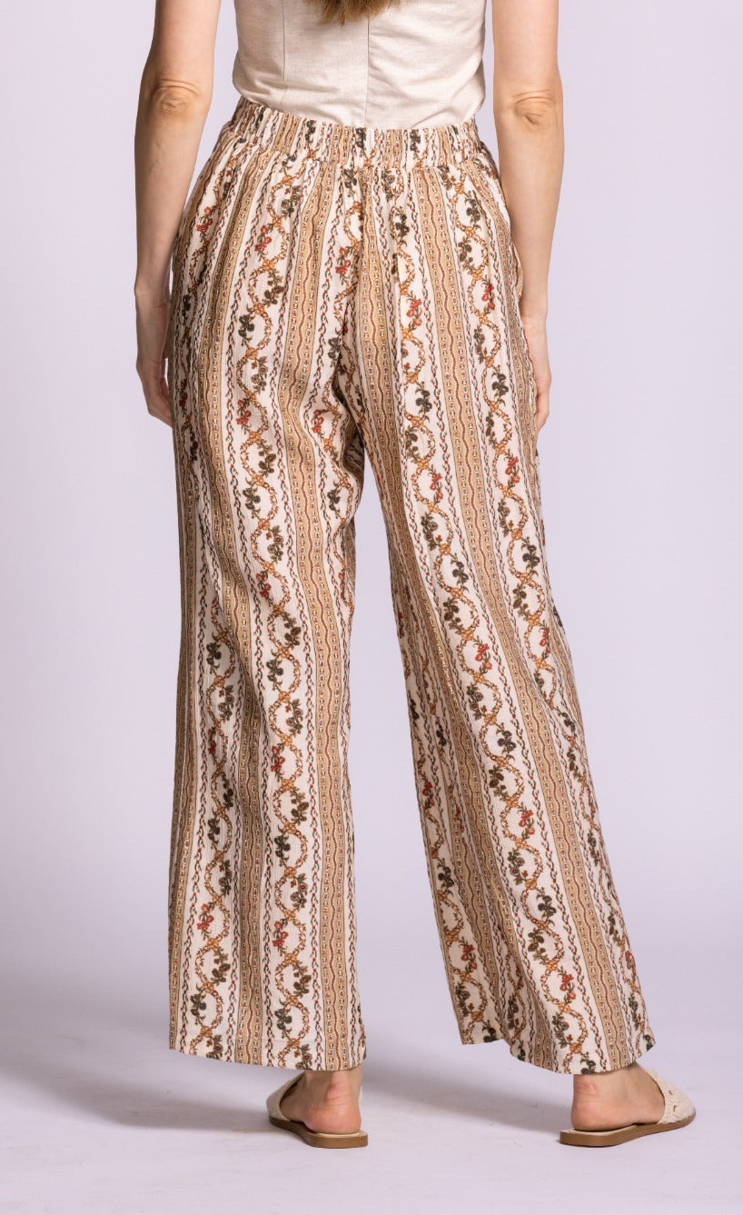 The Teesdale Pants offer a vintage-inspired charm that is absolutely essential for a curated spring wardrobe. Featuring a high-waisted fit and a relaxed, fluid silhouette, they are decorated with intricate vertical stripe and scrollwork patterns. These pants are perfect for spring as the lightweight, breathable fabric ensures all-day comfort during the transition to sunnier days, while the vertical detailing creates an elongating effect that is both flattering and functional. Their stylish appeal lies in the fusion of bohemian print and modern tailoring, making them easy to pair with a simple tank or a crisp linen blouse for a look that is effortlessly polished and trend-forward.