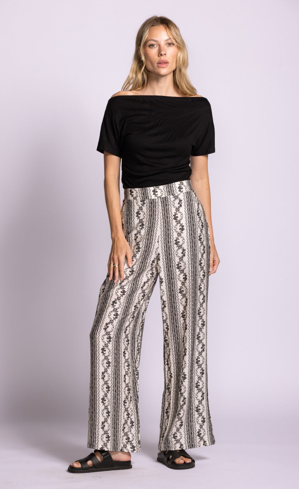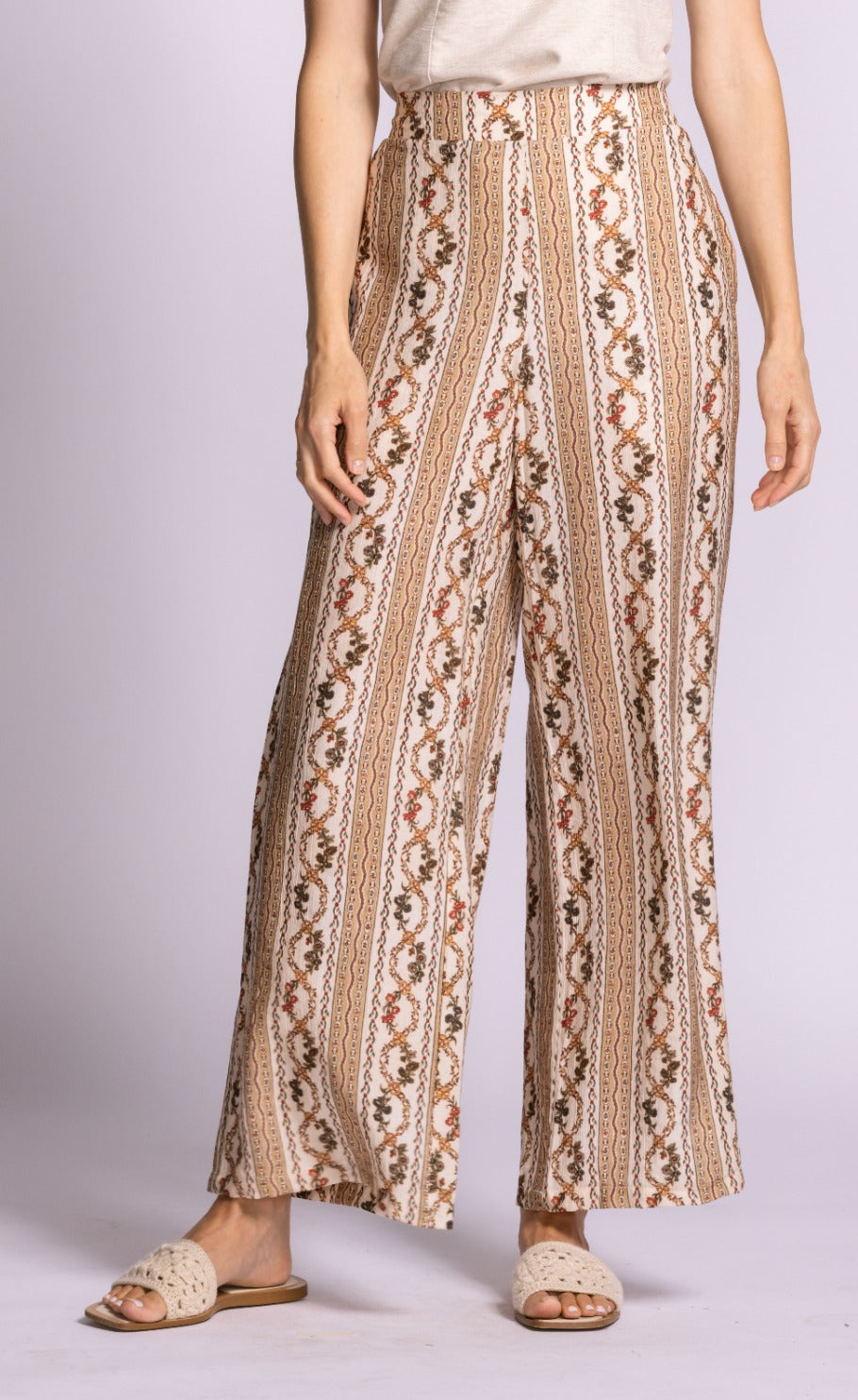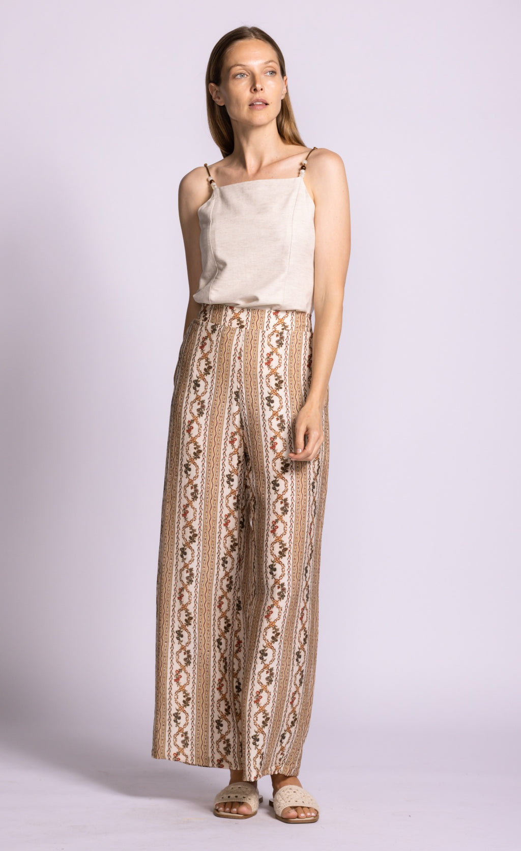 The Teesdale Pants offer a vintage-inspired charm that is absolutely essential for a curated spring wardrobe. Featuring a high-waisted fit and a relaxed, fluid silhouette, they are decorated with intricate vertical stripe and scrollwork patterns. These pants are perfect for spring as the lightweight, breathable fabric ensures all-day comfort during the transition to sunnier days, while the vertical detailing creates an elongating effect that is both flattering and functional. Their stylish appeal lies in the fusion of bohemian print and modern tailoring, making them easy to pair with a simple tank or a crisp linen blouse for a look that is effortlessly polished and trend-forward.