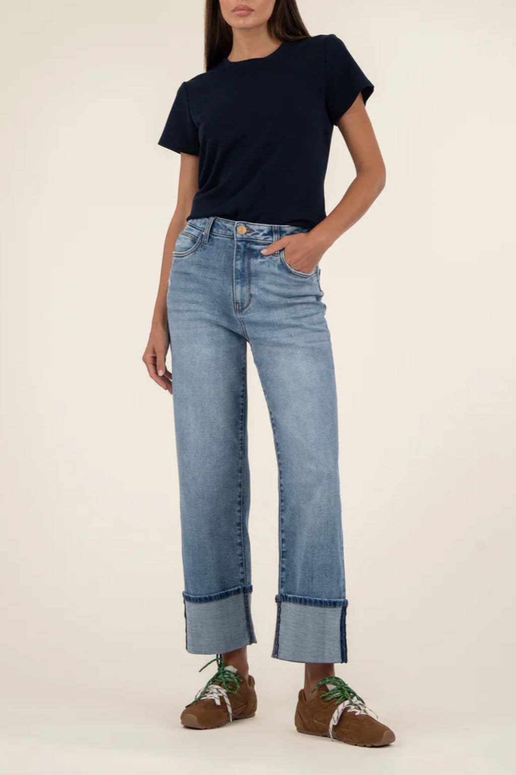 Elevate your everyday with these high-rise straight-leg jeans in a timeless medium wash. The roll-up hem adds a playful edge, while stretchy fabric ensures comfort that keeps up with your day.