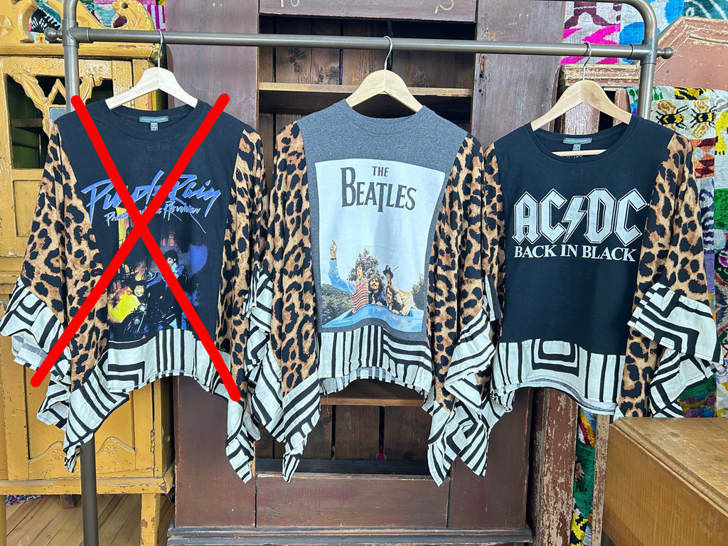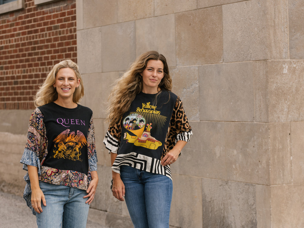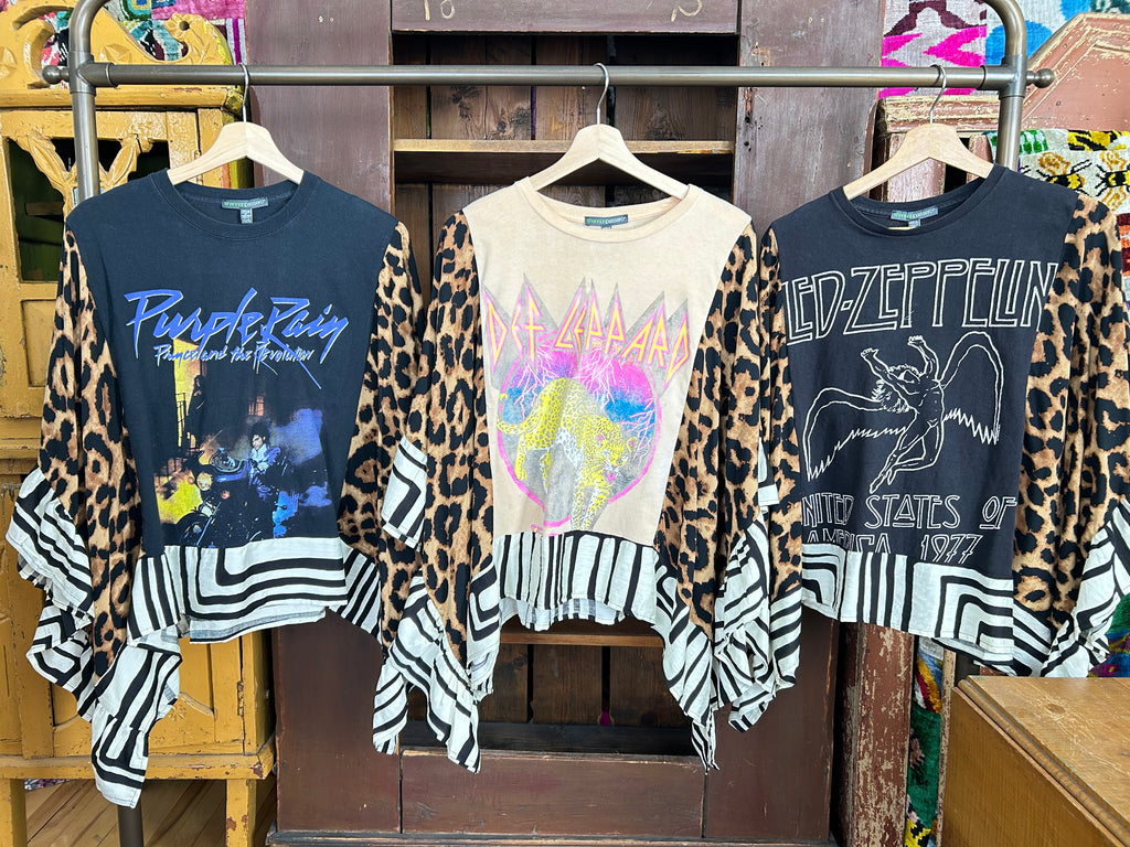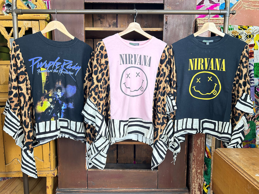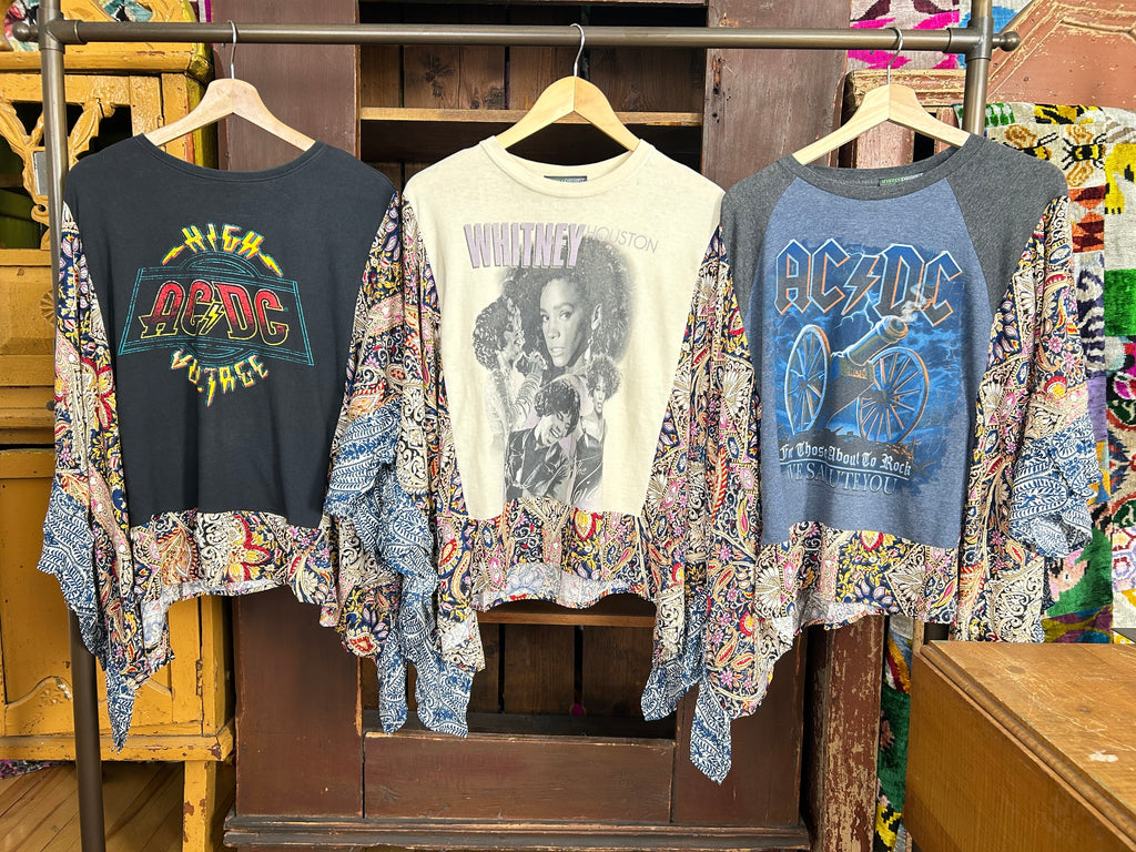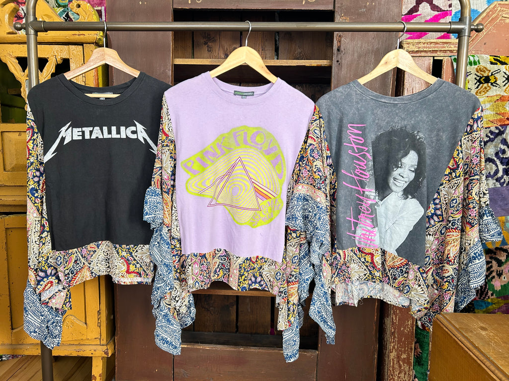 These pieces have been made using upcycled Rock band tees, each piece is one-of-a-kind and designed combining deconstructed vintage denim and upcycled band tees. This diverts it from the landfills and gives it new life.