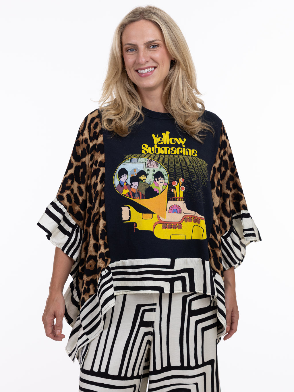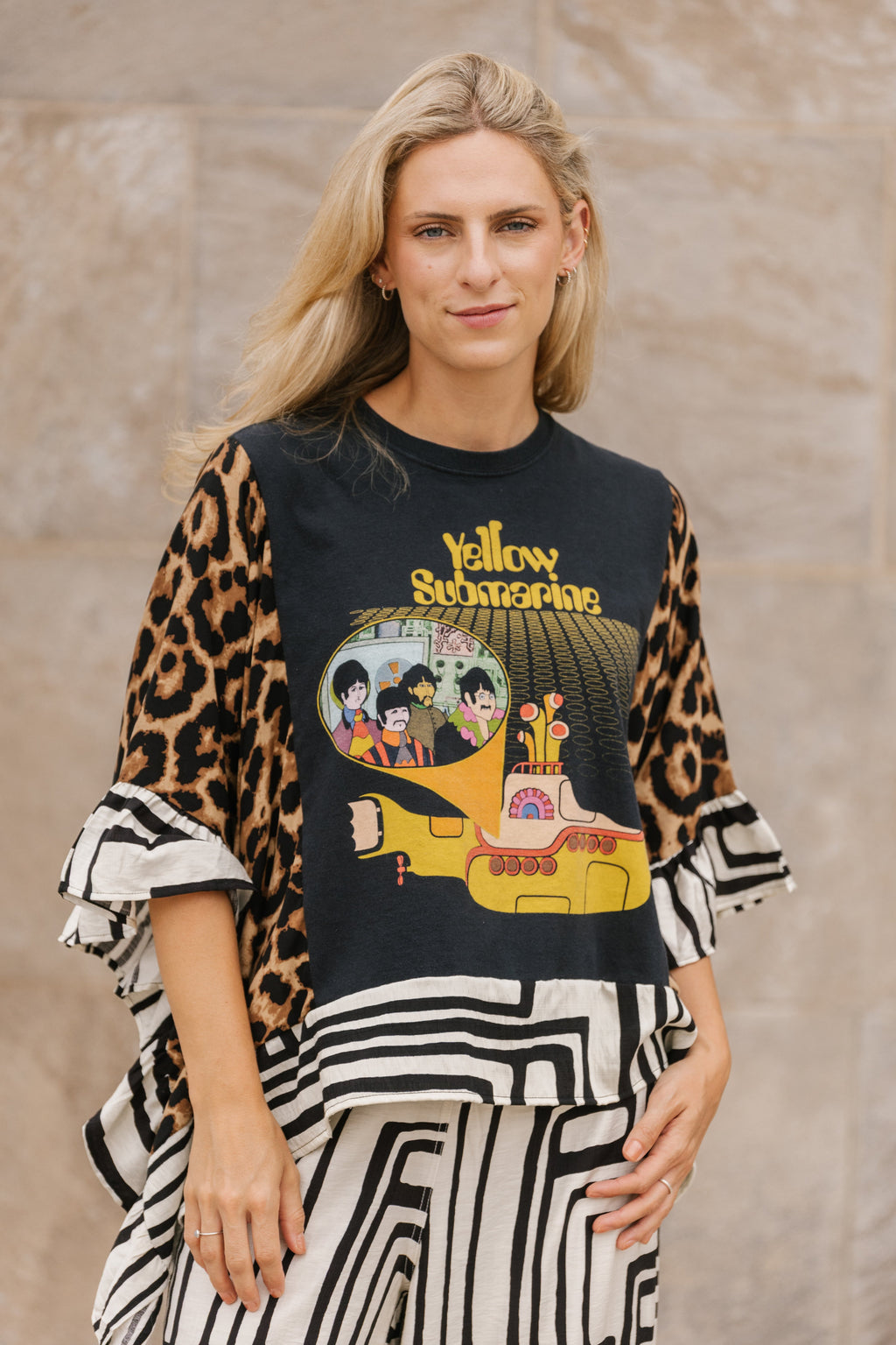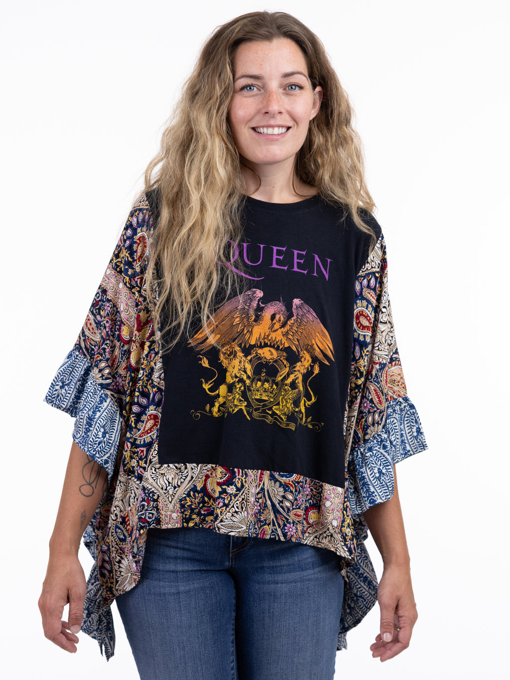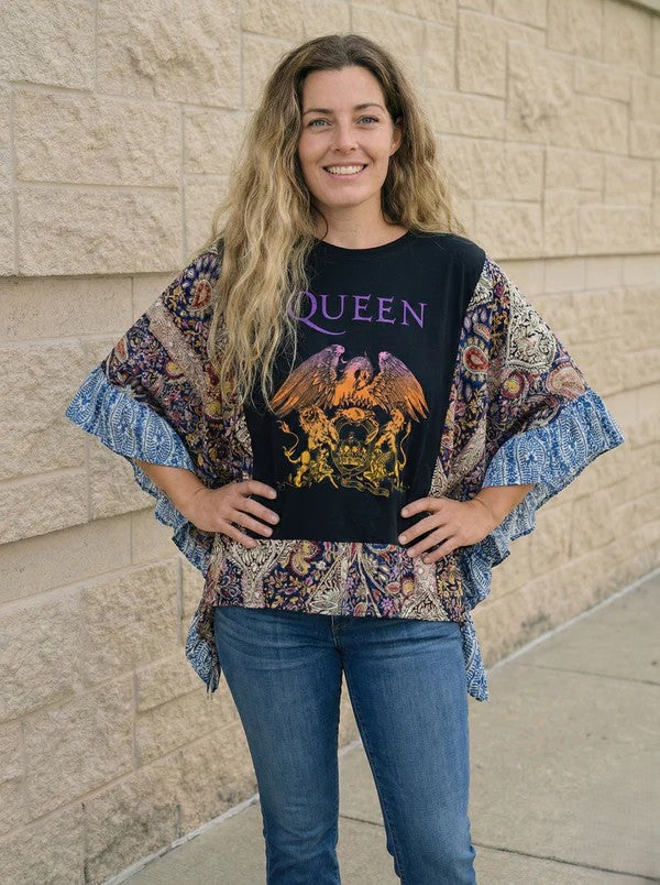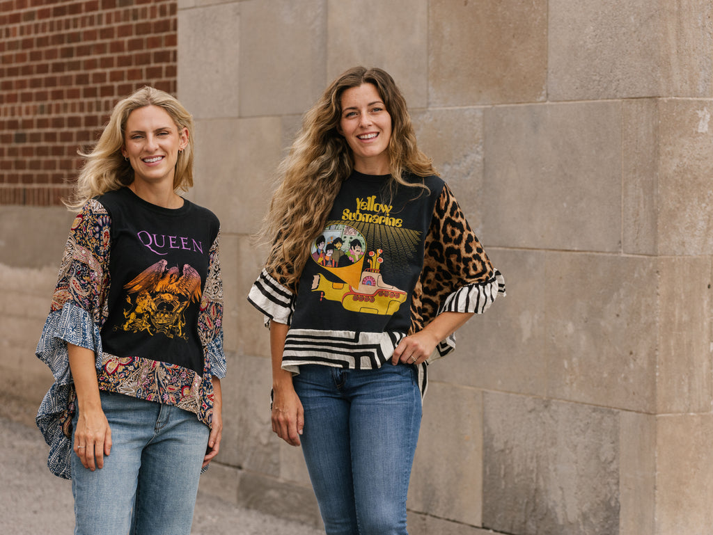 These pieces have been made using upcycled Rock band tees, each piece is one-of-a-kind and designed combining deconstructed vintage denim and upcycled band tees. This diverts it from the landfills and gives it new life.