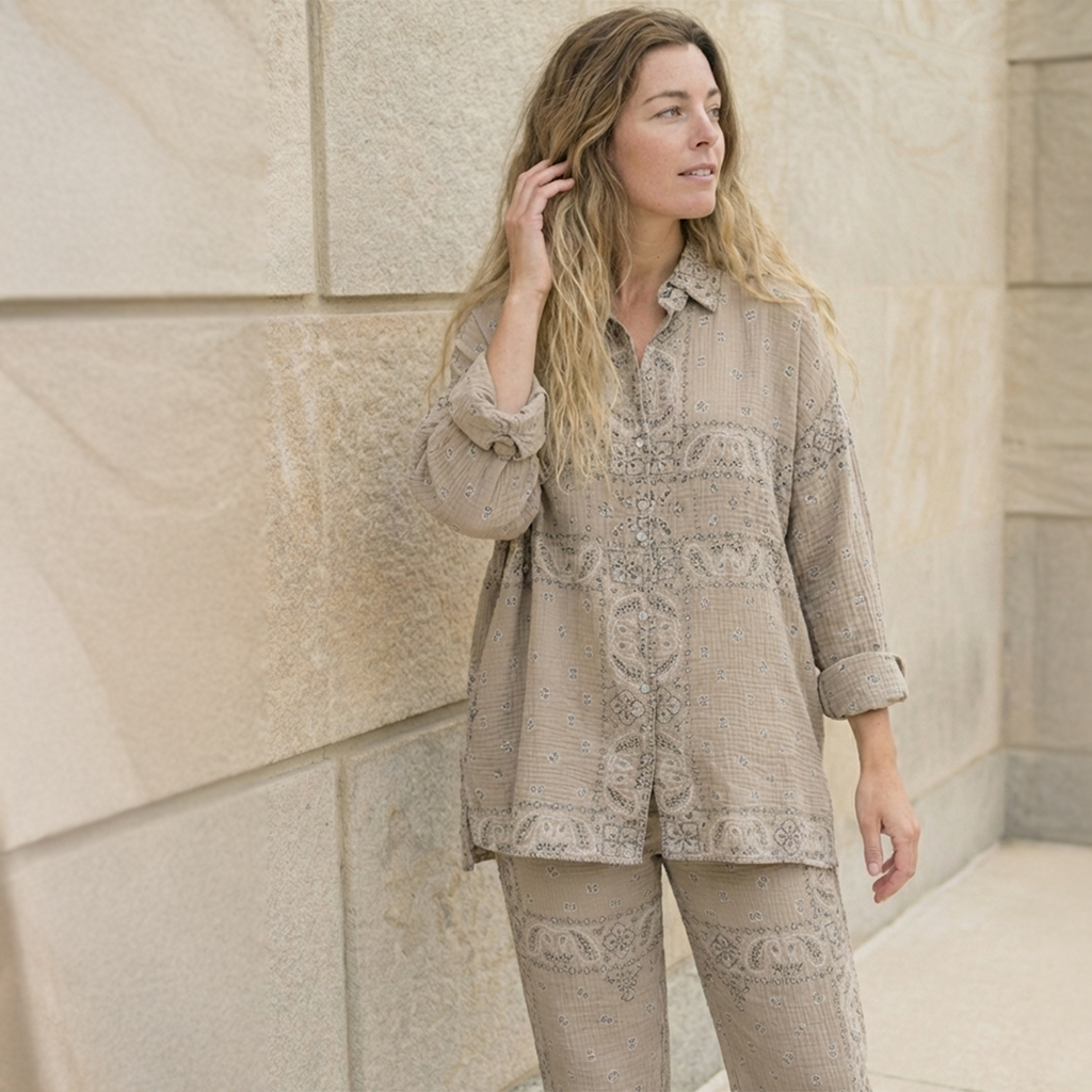 Our Cotton Gauze fabric is made of soft 100% natural cotton fibers, that make it breathable, hypoallergenic and light-weight. It is woven using a special technique that involves twisting horizontal warp threads around the vertical weft threads, resulting in a soft, crinkled, and loosely-woven texture with a slight vertical stretch. We focus on having minimal environmental impact by carefully selecting materials like this Cotton Gauze and printing small runs to make sure we print just what we need. It is a wonderful, long-lasting material.