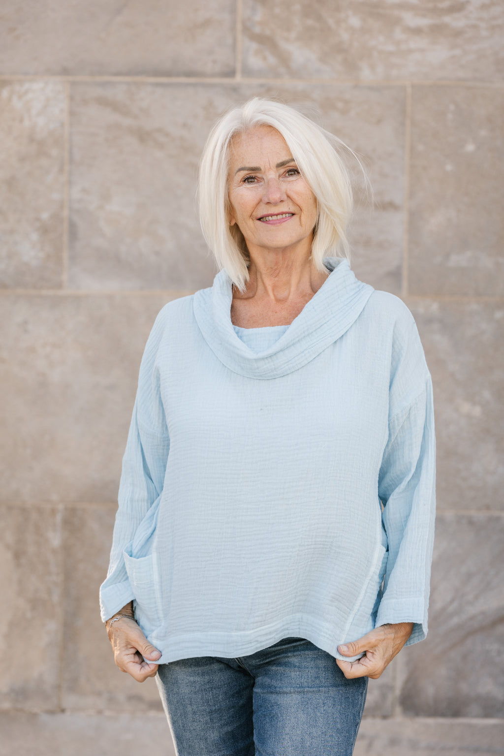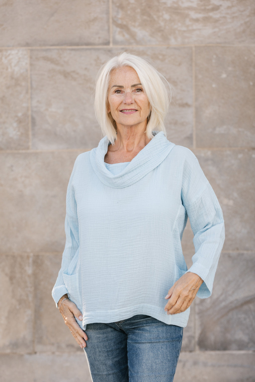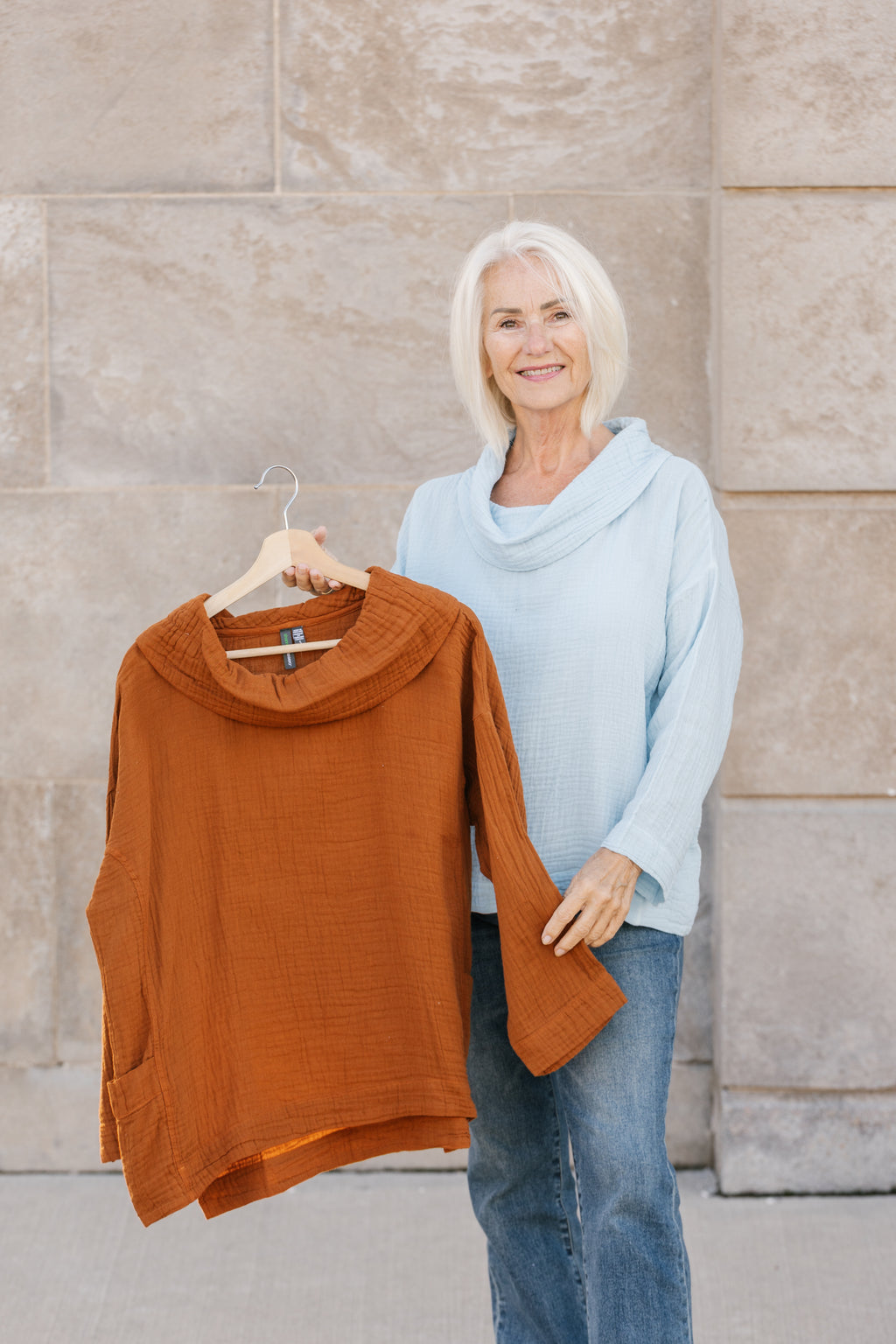 Our Cotton Gauze fabric is made of soft 100% natural cotton fibers, that make it breathable, hypoallergenic and light-weight. It is woven using a special technique that involves twisting horizontal warp threads around the vertical weft threads, resulting in a soft, crinkled, and loosely-woven texture with a slight vertical stretch. We focus on having minimal environmental impact by carefully selecting materials like this Cotton Gauze, as it is a wonderful long lasting material and local to our artisan maker’s region.
