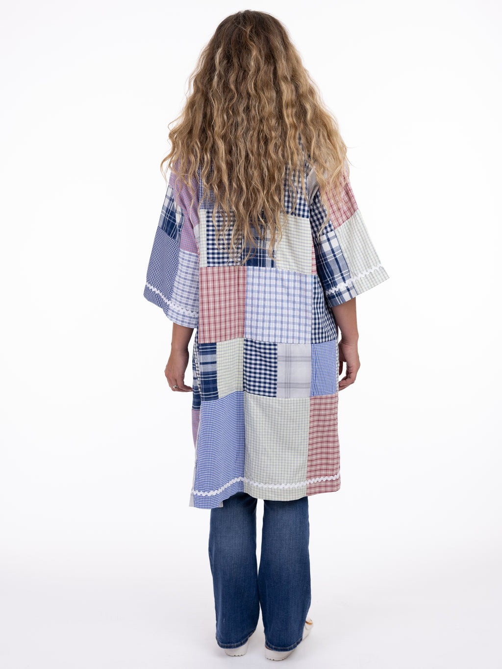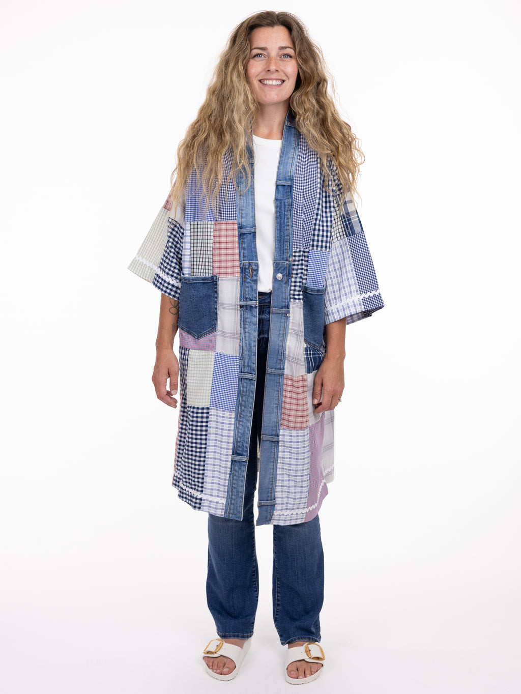 These pieces have been made using upcycled button down shirt, each piece is one-of-a-kind and designed combining deconstructed vintage denim and upcycled button down shirt. This diverts it from the landfills and gives it new life.