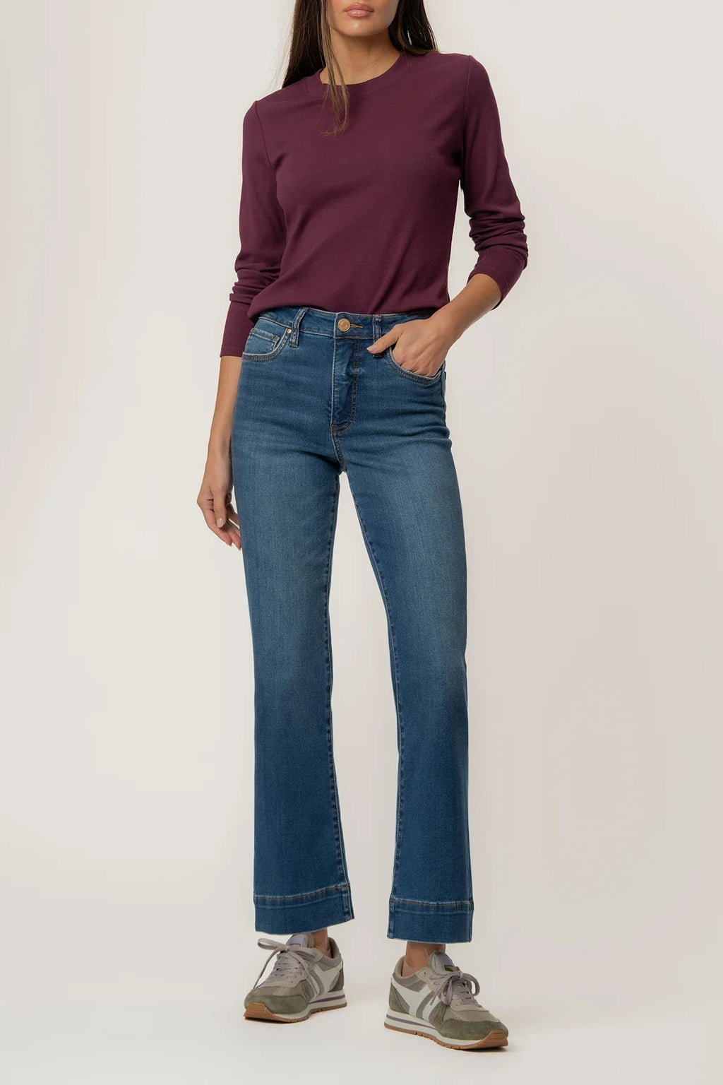 • Flatter your shape and elevate your style with these high rise ankle flare jeans, crafted in a rich dark wash with a bold wide hem for a standout finish. Built-in Fab Ab pockets smooth and support, while the stretchy material ensures all-day comfort with a structured feel.