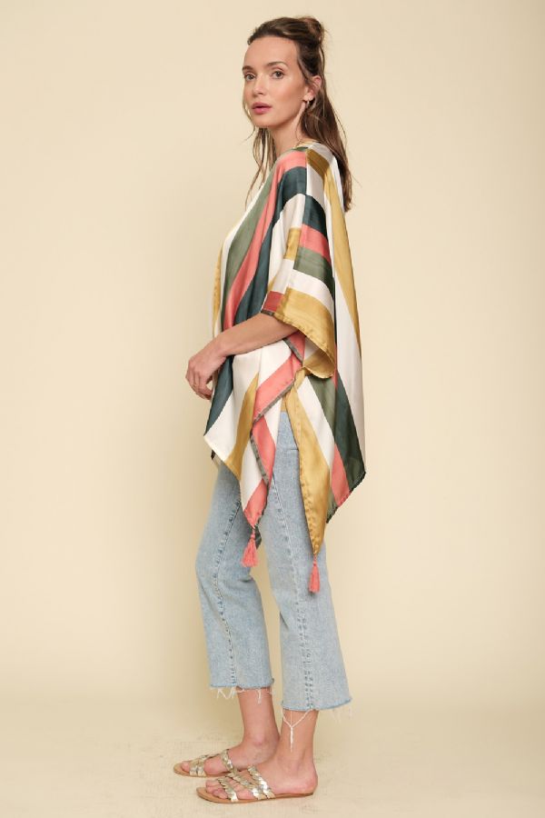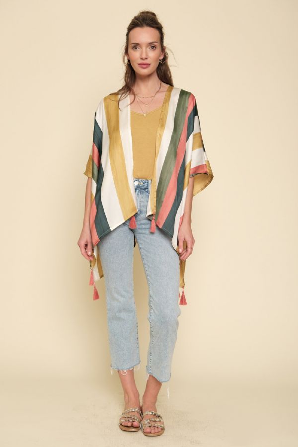 Capture the glow of a sunset with the Leah Stripe Kimono, a layering piece that radiates warmth and sophistication. Crafted from a fabric with a silky, satin-like finish, it drapes elegantly over the shoulders, catching the light with every move. Finished with playful pink tassel accents at the hem, it adds a touch of bohemian whimsy to its luxurious appeal.
