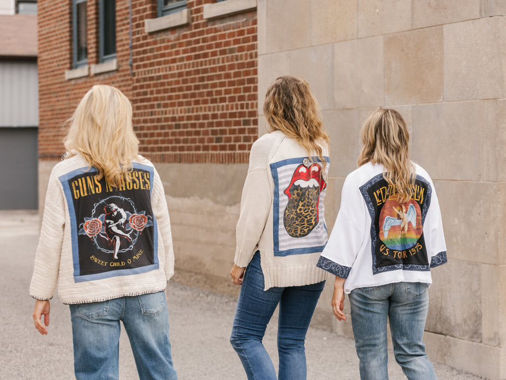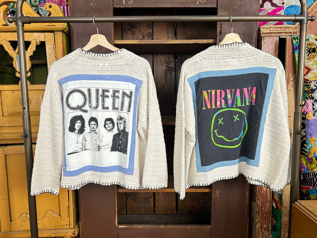 These pieces have been made using upcycled Rock band tees, each piece is one-of-a-kind and designed combining deconstructed vintage denim and upcycled band tees. This diverts it from the landfills and gives it new life.